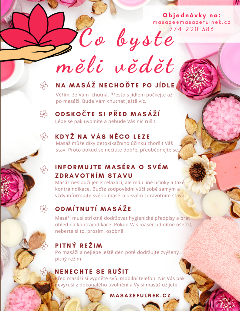 Zábaly a zvýhodněné balíčky Rašelinový zábal20 minut samostatného rašelinového zábalu. Medový zábal20 minut samostatného medového zábalu. Balíček Rašelina20 minut rašelinového zábalu 40 minut masáže Medový detox20 minut medový zábal na záda 100 minut reflexní lymfatická masáž CENÍK SLUŽEB Chceš se objednat nebo máš dotaz? Můžeš využít kontakní formulář: Chcete-li vyplnit tento formulář, prosím povolte v prohlížeči JavaScript.Jméno a Příjmení *Email *Vaše zpráva *Odeslat